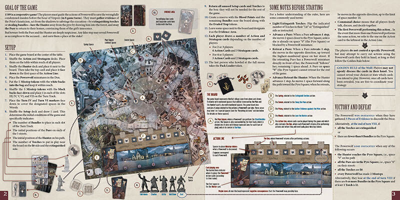 1589 is a cooperative game! Players must lead the actions of the Powerwolf to save the wrongfully condemned maiden before the hour of Vespers (within 8 game turns). They will gather evidence of the Prior’s fanaticism, act from the shadows to sabotage the execution—by extinguishing torches or stealing bundleslure the Hunter away from the pyre by drawing him into the forest, and sway the Pure to return to their homes, swaying them of the girl’s innocence. But beware: both the Pure and the Hunter are deeply suspicious. Any false step may reveal the Powerwolf as accomplices to the accused… and earn them a place at the stake!